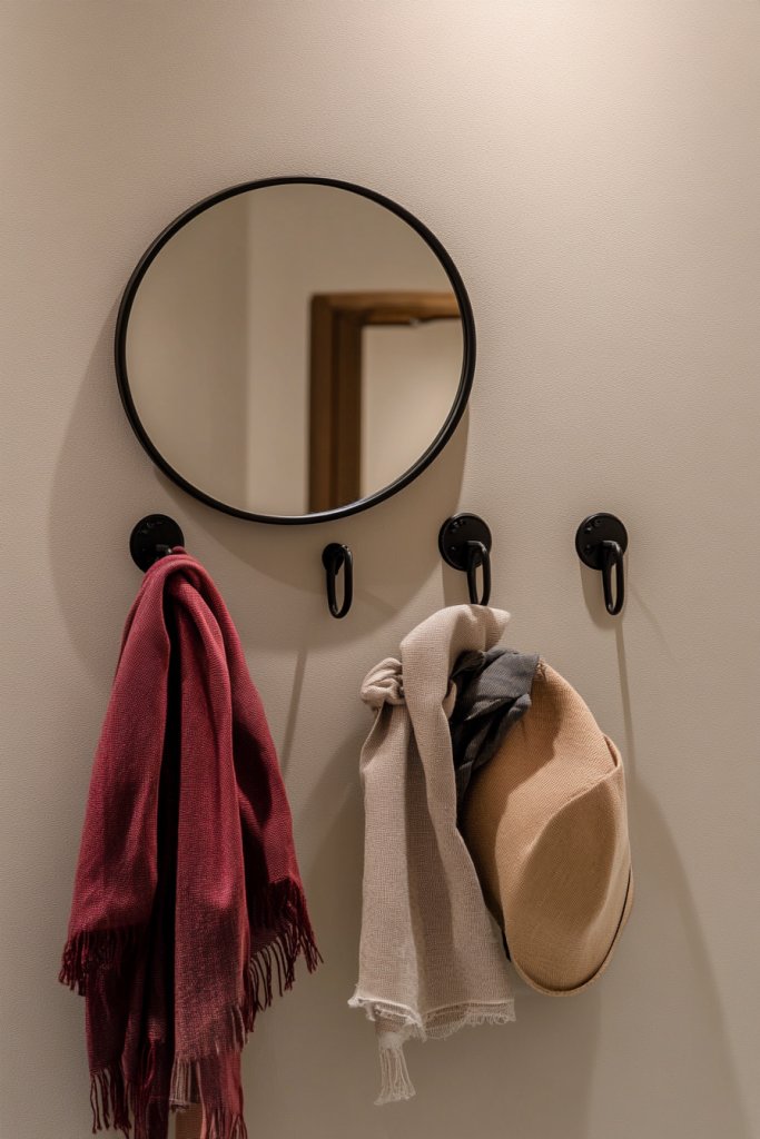 Cluttered floors and crowded shelves make getting ready a hassle. A small mirror mounted on the wall can boost your space’s functionality while helping you check your outfit on the spot. Adding hooks for bags, hats, or scarves keeps everything organized and within easy reach. It’s a simple upgrade with big benefits.