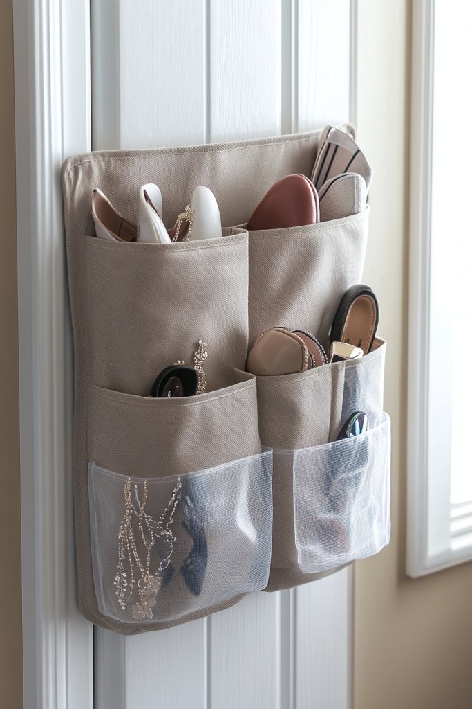 Add decorative labels or fabric covers to match your room’s style. Use different pocket sizes to accommodate various items, from flats to high heels. Incorporate small hooks or clips for keys or jewelry. Personal touches like colorful trims or patterned fabrics make the organizer feel more inviting and personalized.