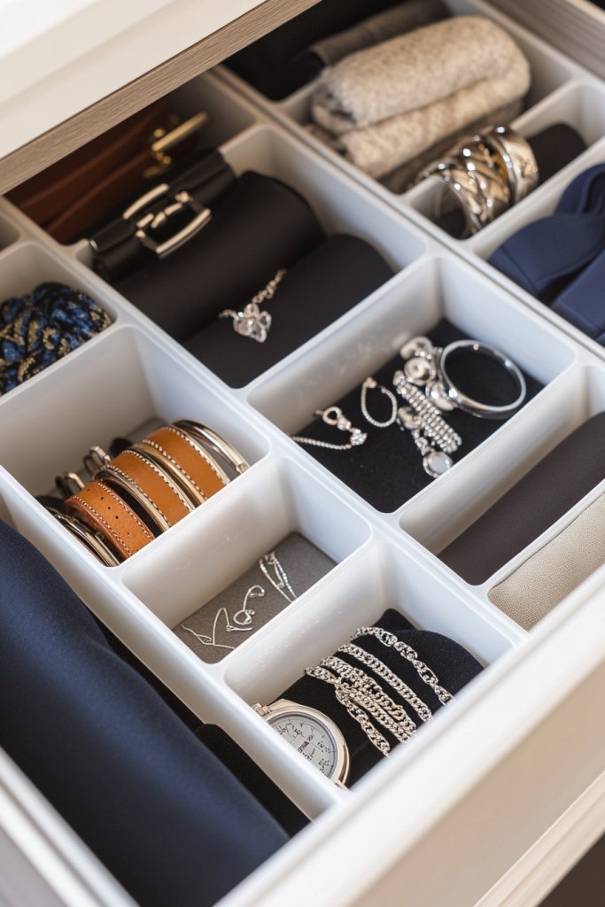 Picture sleek, adjustable dividers creating compartments within your drawers, each dedicated to a specific item. Socks are rolled into neat bundles, jewelry is separated by type, and belts are hung or folded in designated sections. The entire drawer looks tidy and inviting, with everything visible at a glance. It’s like having a personal organizer right inside your dresser.