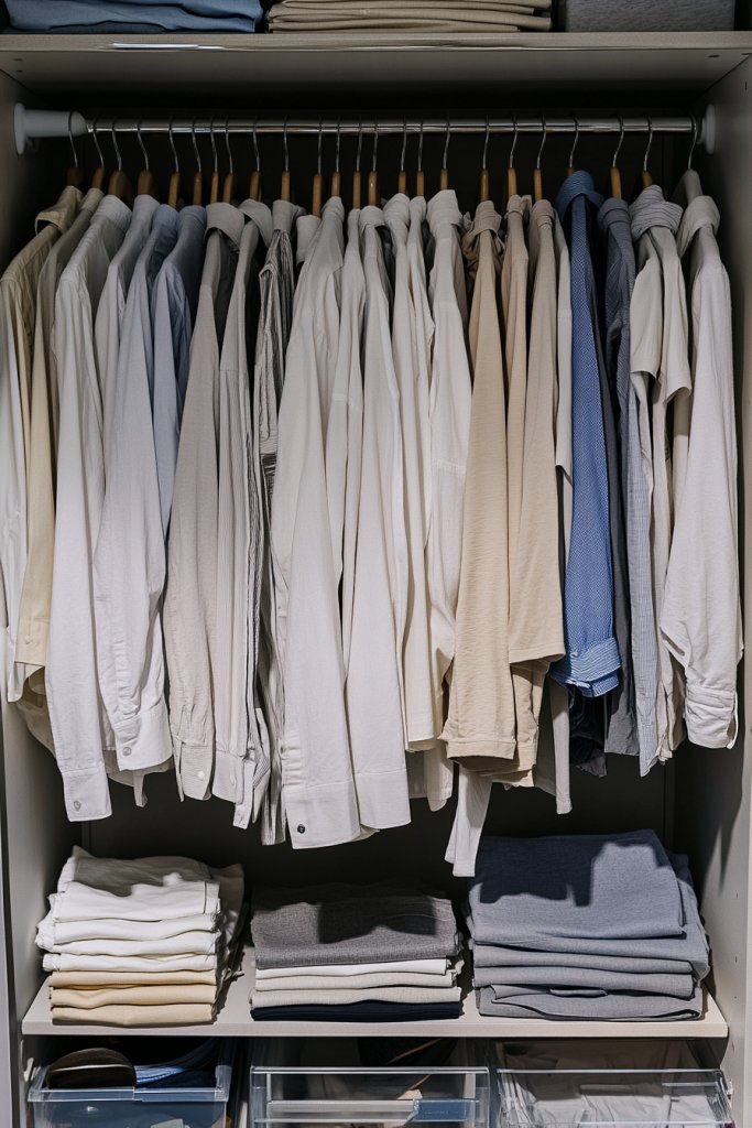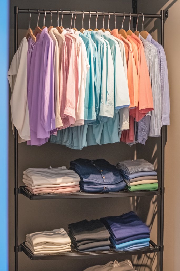 Visualize your wardrobe arranged by shades—blues, reds, neutrals—each section clearly labeled or naturally separated. The color flow creates a pleasing aesthetic, almost like a gradient palette. Seeing your clothes organized by hue makes it easier to coordinate outfits and plan your looks. It transforms your closet into a visual masterpiece.