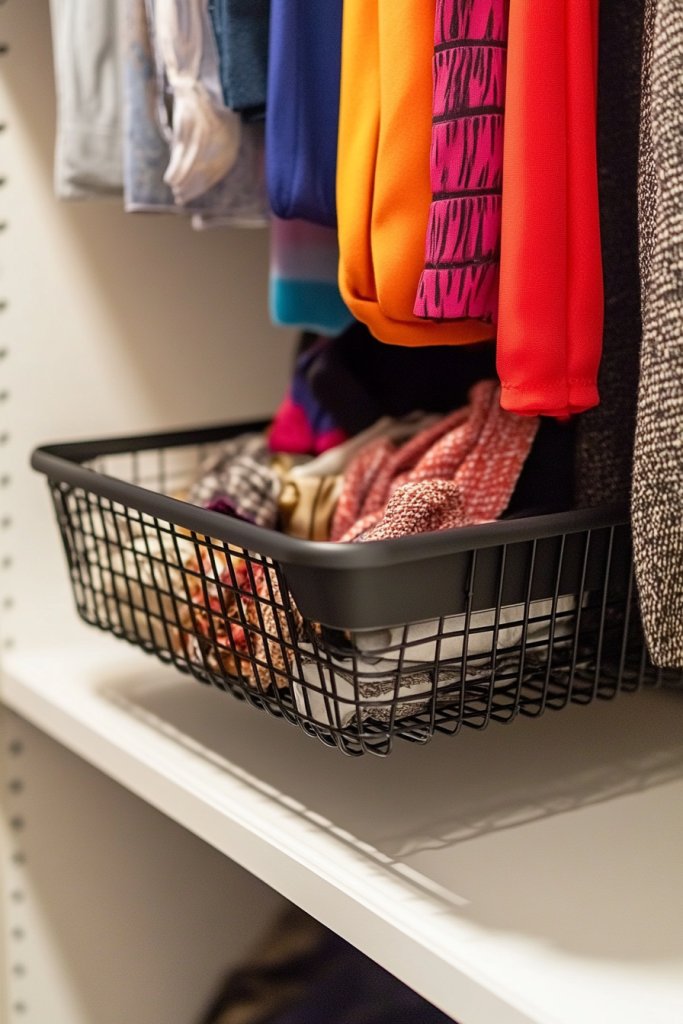 Imagine a basket hanging beneath a shelf, filled with scarves, small handbags, or folded sweaters. The basket’s open design makes it easy to see and grab your accessories quickly. It adds a layer of organization above your existing shelves without cluttering the surface. The result? A clutter-free, visually appealing closet.