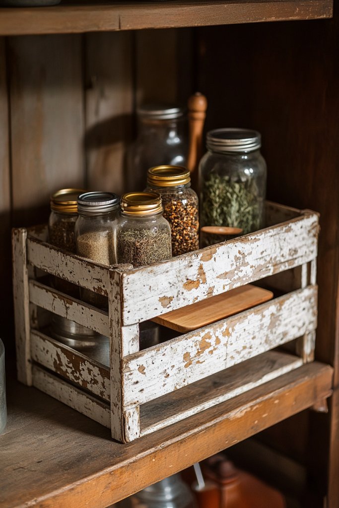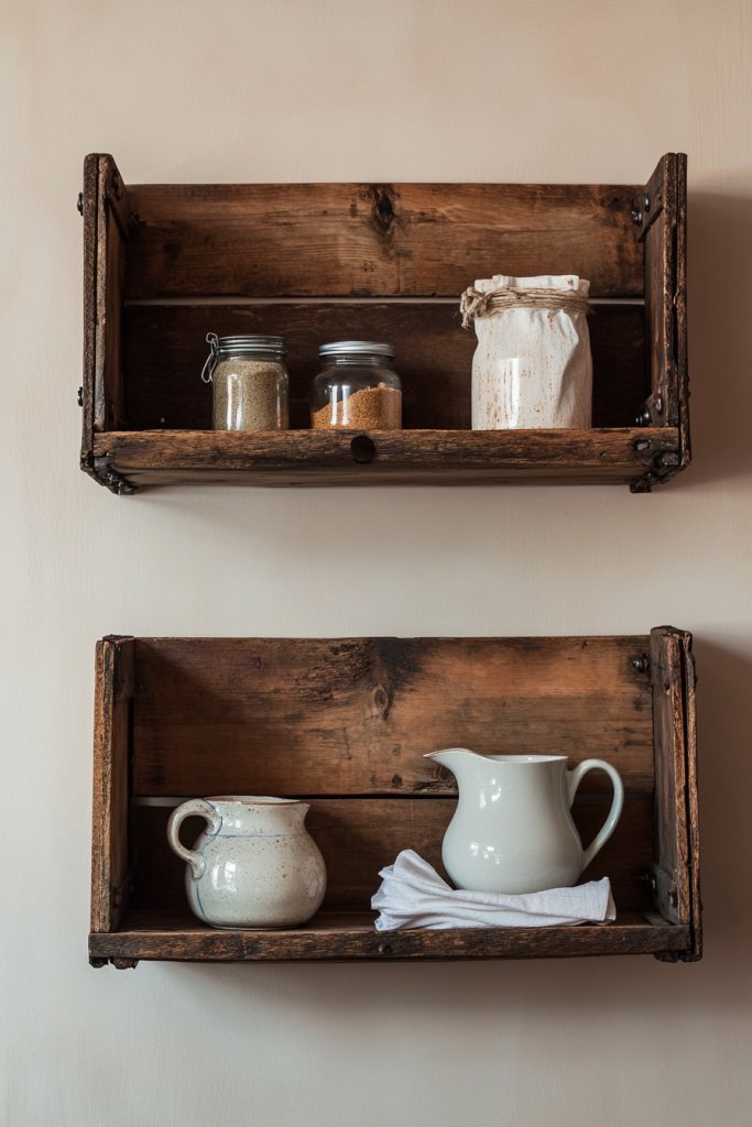 Imagine painted or distressed crates stacked or mounted on the wall, filled with cookbooks, utensils, or decorative items like jars or candles. The weathered wood and imperfect finishes evoke a sense of history, warmth, and personality. They serve as both storage and art, blending rustic appeal with everyday utility. The layered arrangement creates visual depth and invites touch.
