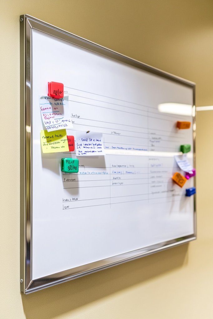 Select a high-quality magnetic whiteboard with a smooth writing surface. Mount it securely with heavy-duty anchors on a clean wall or cabinet face. Use magnetic accessories to organize notes, recipes, or shopping lists. Write with dry-erase markers that wipe clean easily, and keep extra markers and erasers nearby. Regularly update the content to keep it relevant and motivating. Consider pairing with a small basket for storing extra supplies.