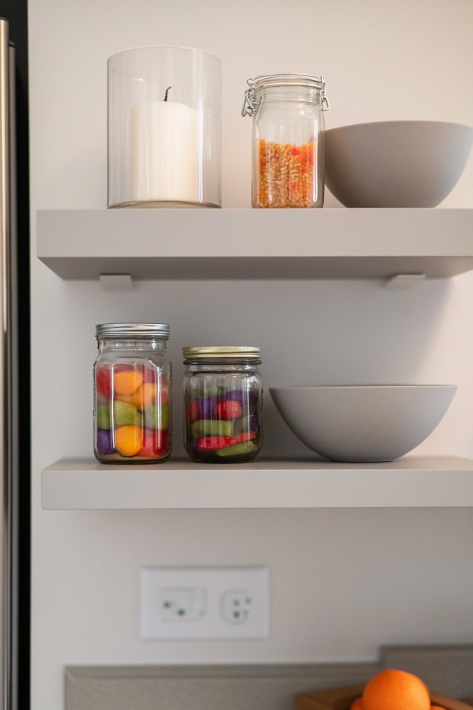 Decorate shelves with themed items—like seasonal dishware, small plants, or artful containers. Incorporate LED strip lighting underneath for ambiance or task lighting. Use labels or tags for jars or dishes to keep everything organized. Change the arrangement periodically for freshness, and match shelf materials with other hardware in your kitchen for a cohesive look. Personal touches like framed quotes or miniature sculptures can elevate the display.