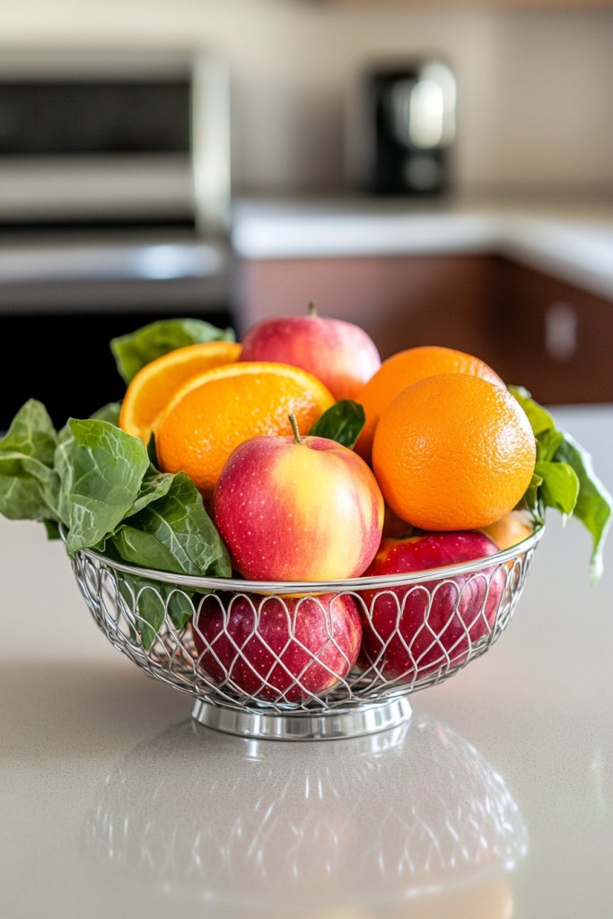 Picture a decorative wire or ceramic bowl filled with bright apples, oranges, and leafy greens sitting atop your fridge or countertop. The open design enhances airflow, keeping produce fresh longer. The vibrant colors contrast with neutral countertops or sleek appliances, adding life and cheer to your space. The arrangement invites you to grab a snack or ingredient, encouraging healthy habits.