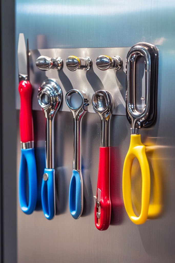 Picture a magnetic strip or board mounted on the side of your fridge or wall, holding a variety of small tools—wine openers, scissors, or measuring spoons. The shiny surfaces and organized layout create a modern, streamlined look. Brightly colored handles or tool accents pop against the magnetic background, making everything easy to find and use. The display combines practicality with a touch of industrial chic.