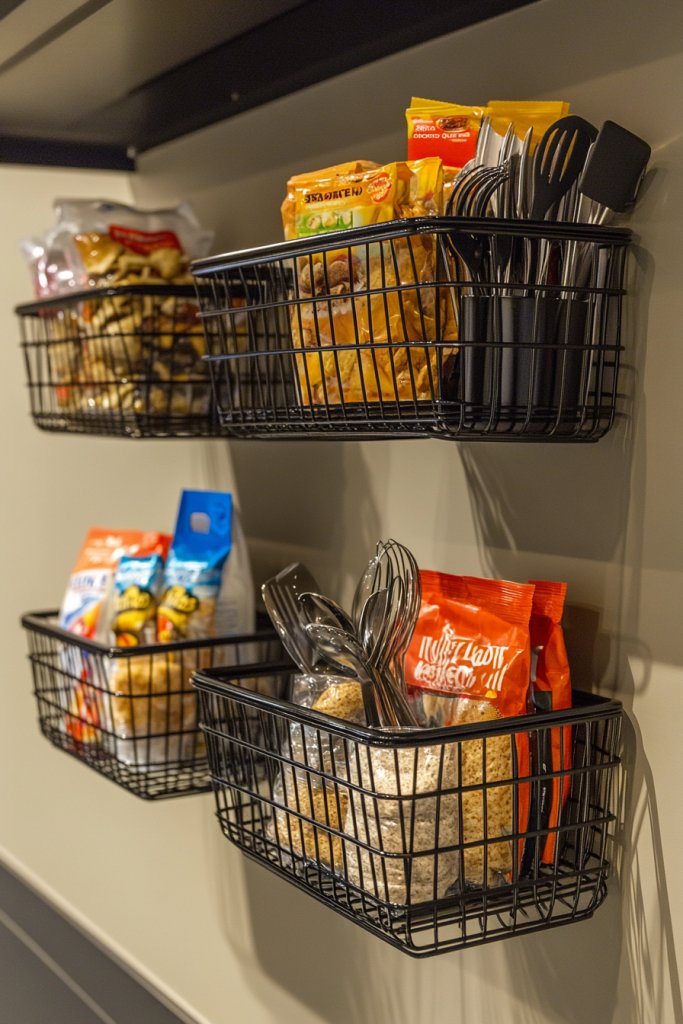 Add decorative liners, fabric wraps, or chalkboard tags for each basket to personalize and organize further. Mix and match finishes to create a layered, eclectic look or keep it uniform for a minimalist vibe. Incorporate small hooks or clips for hanging utensils or keys nearby. Change basket contents seasonally to keep the space lively and functional.