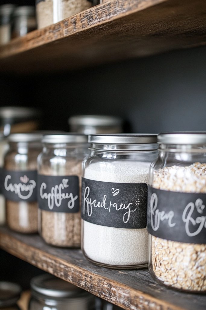 Imagine clear glass jars or colorful baskets with handwritten labels in elegant or playful fonts. Chalk markers add a vibrant, customizable touch that can be easily erased and rewritten. The labels stand out against the containers, creating a cohesive, styled look. This setup makes your kitchen look curated, inviting, and easy to navigate. It’s a small detail that makes a big difference.
