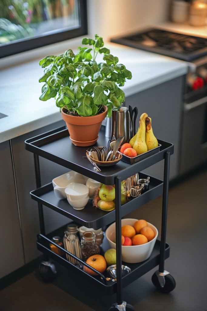 Picture a sleek, wheeled cart with multiple tiers, topped with a soft cloth or decorative tray. It holds everything from cutting boards and utensils to small appliances or decorative accents like candles or vases. The wheels allow you to reposition it easily, making your kitchen more dynamic. The finish—metal, wood, or painted—matches your style, blending practicality with aesthetic appeal.