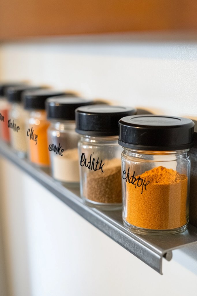 Create custom labels with your own fonts or designs for a unique look. Incorporate color coding—red for chili powders, green for herbs—to make identification even faster. Enhance with a small magnetic tray or caddy for organizing extra small containers or utensils. Change the arrangement seasonally or for different cuisines to keep your spice game exciting. Add a few decorative touches, like a chalkboard label or patterned cloth cover for a personalized feel.