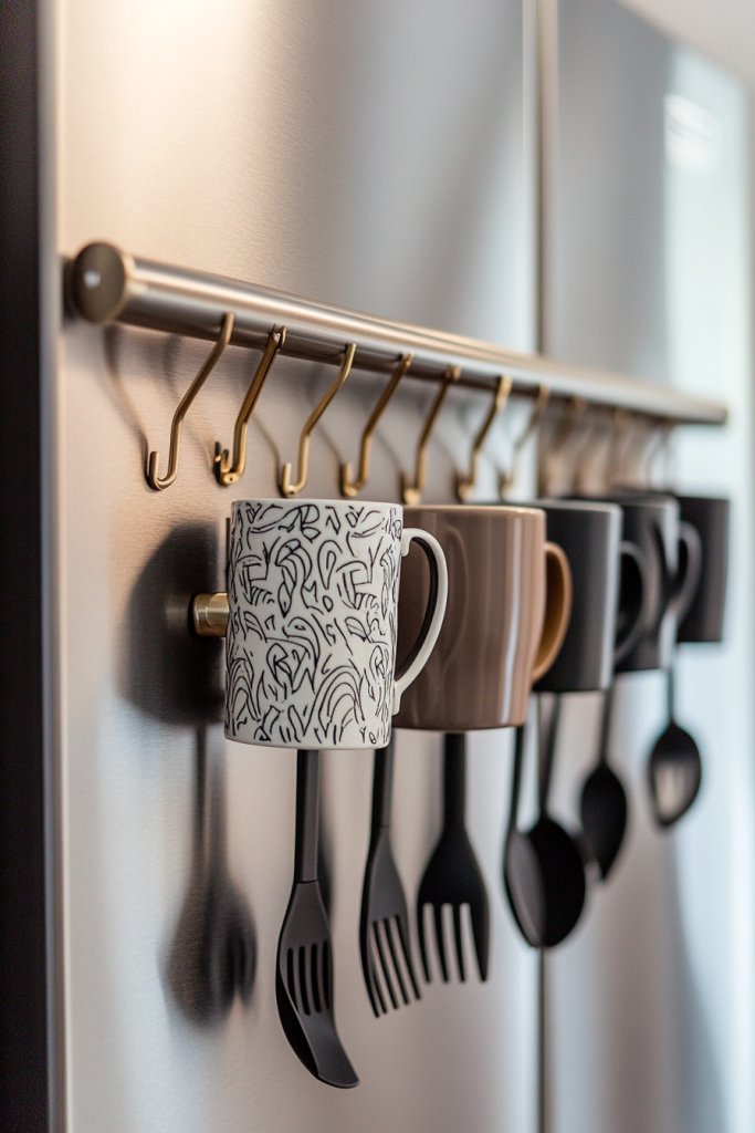 Envision a row of decorative hooks mounted on a sleek metal rod or a wooden plank above your fridge. Mugs with unique patterns hang neatly, while sturdy hooks hold spatulas, ladles, or measuring spoons in an organized cascade. The display adds an inviting, lived-in vibe that combines practicality with personality. The hooks’ finishes—brushed brass, matte black, or rustic iron—complement various styles, from farmhouse to modern.