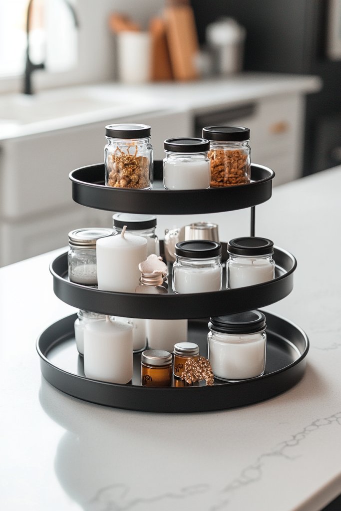 Cluttered counters and shelves can make your kitchen look chaotic and uninviting. A tiered tray offers a stylish way to display small decor items and keep essentials organized. It creates a focal point that combines function and fashion effortlessly. Who said your space can’t be both pretty and practical?