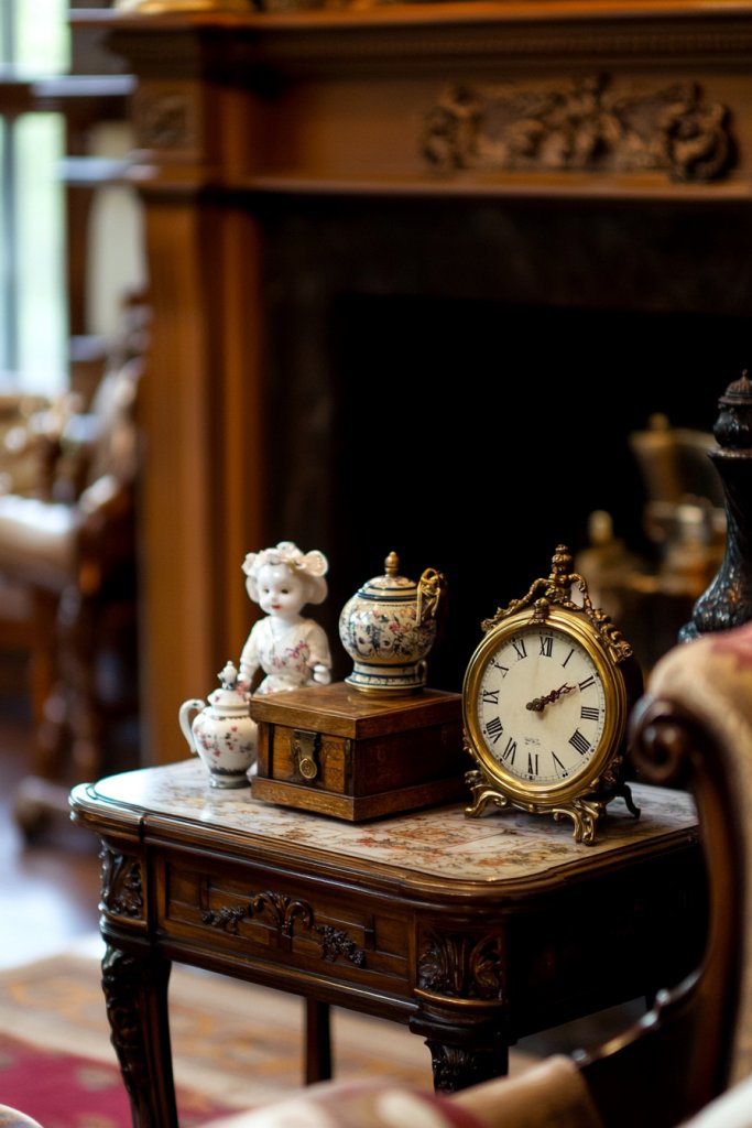 Imagine ornate brass or gilt picture frames holding old family photos, paired with vintage ceramic vases and intricate candleholders. Small sculptures or figurines in patinated metals sit on side tables or shelves, adding charm. The color palette features muted tones, aged finishes, and textured surfaces that evoke nostalgia, creating a warm, inviting atmosphere.