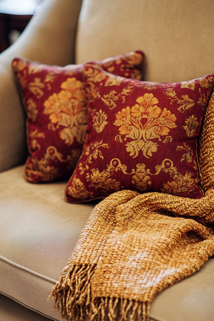 Picture a plush floral or paisley cushion resting on a vintage armchair, paired with a soft cream throw blanket in chunky knit. The textures and patterns add visual interest and comfort, making the space feel layered and lived-in. The cushions feature rich embroidery or piping, complementing the room’s color palette. It’s a cozy corner that screams relaxed elegance.