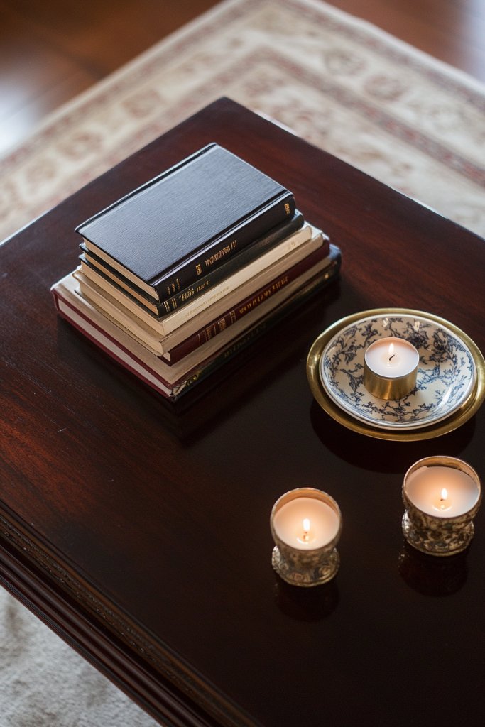 Imagine a classic wooden coffee table topped with a stack of beautifully bound books, a vintage brass tray, and a few candles in ornate holders. Neatly arranged bowls or small sculptures add interest without overcrowding. The table’s surface is purposeful but not cluttered, creating a welcoming yet sophisticated vibe. It’s a space that encourages lingering.