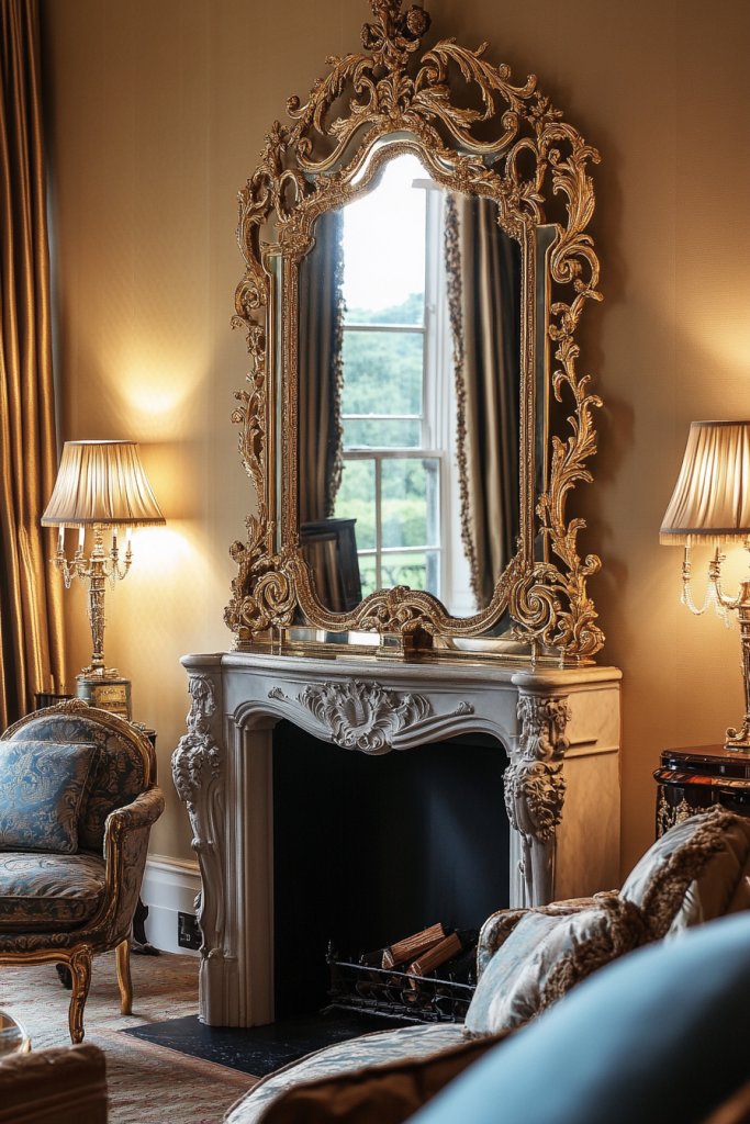 Picture a large, vintage mirror with a gilded, baroque frame hung above a fireplace or console table. Its intricate carvings catch the light, casting beautiful reflections around the room. The mirror’s size and ornate details create a focal point that makes the space feel larger and more luxurious. The reflection adds depth and brightness, brightening even darker corners.
