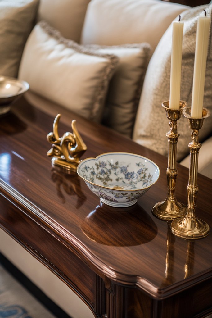 Imagine a sleek wooden console with carved details, topped with a cluster of vintage picture frames, a decorative clock, and a ceramic sculpture. A soft runner or cloth adds texture, while small decorative accents like brass figurines or antique keys bring personality. Positioned behind a sofa, it creates a layered, curated look that invites guests in and offers a surface for everyday essentials.