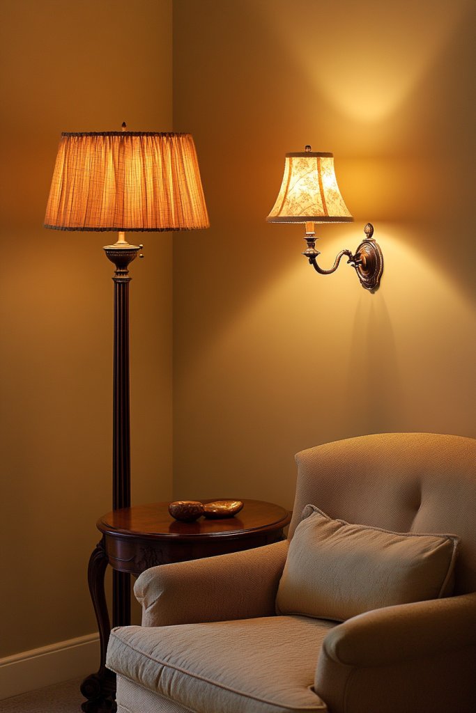 Picture wall sconces with fabric shades mounted on either side of a fireplace or mirror, casting a soft glow. Tall, vintage-style floor lamps with warm bulbs fill dark corners, adding depth and warmth. The layered lighting creates a gentle, welcoming ambiance that makes the room feel plush and lived-in. The light reflects subtly off textured walls and furniture, enhancing the overall mood.