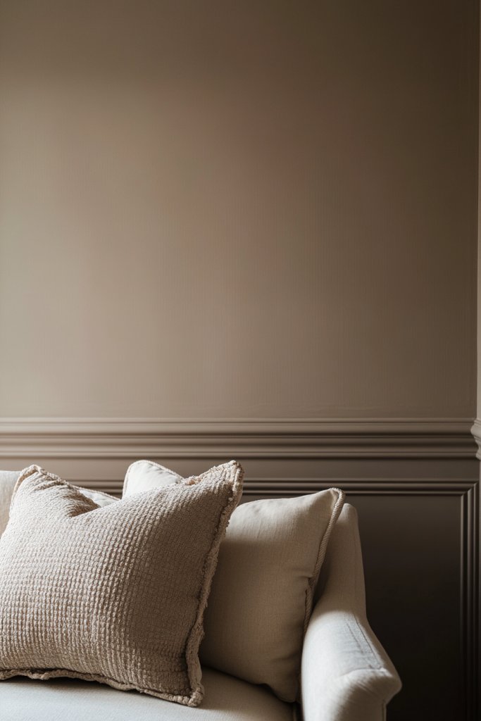 Picture walls painted in soft beige with a hint of taupe, textured with a subtle linen or plaster finish. The warm hue reflects natural light beautifully, creating a gentle glow that makes the room feel welcoming. Architectural details like wainscoting or beadboard painted in matching tones add depth and visual interest without cluttering the space. The overall effect is understated elegance.