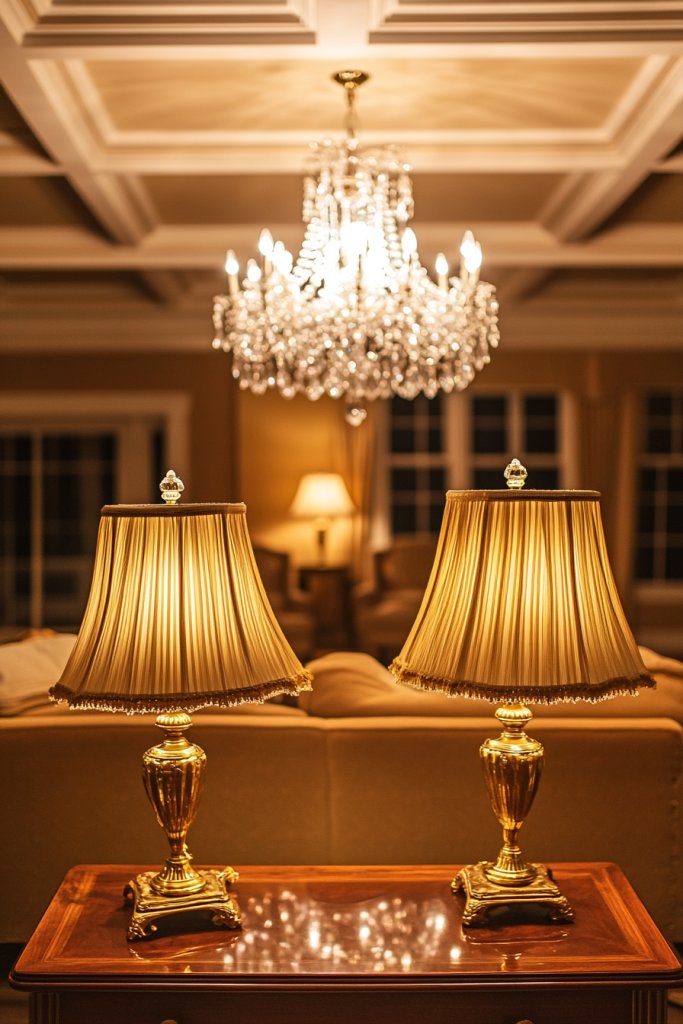 7. Traditional Lighting with Chandeliers and Table Lamps