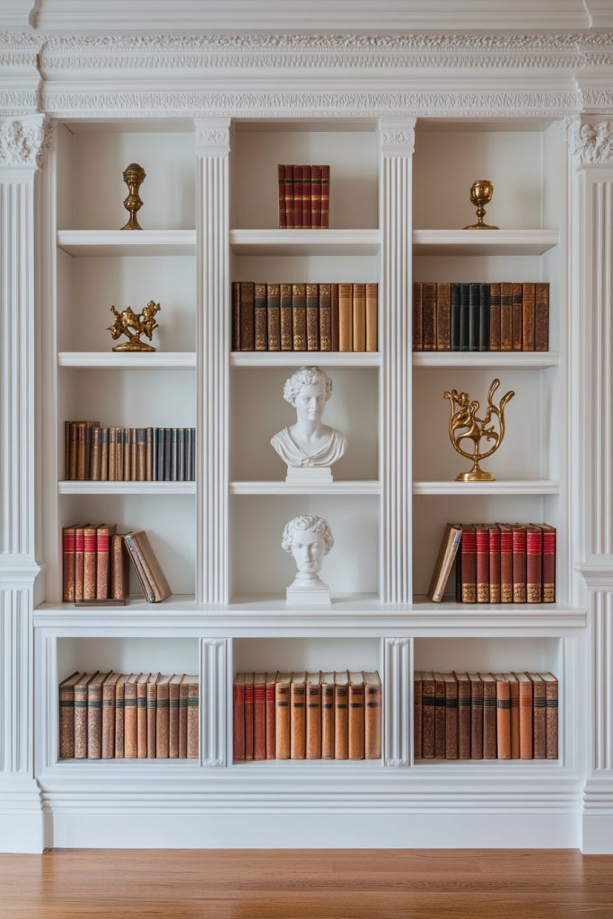 Visualize a wall of custom-built shelves with intricate crown molding framing the units. The shelves hold a curated collection of books, vintage vases, and decorative boxes, all arranged thoughtfully. The molding and paneling give a tailored, architectural feel, making the shelves appear as part of the wall rather than an afterthought. Warm wood tones add richness, while subtle lighting highlights your favorite pieces.
