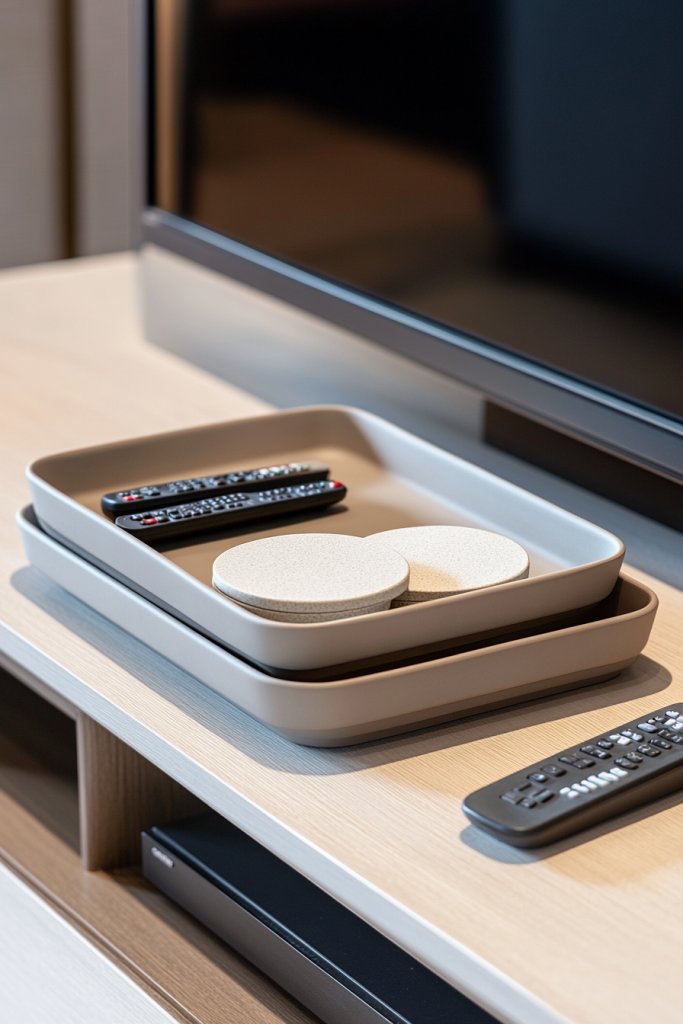 Use coasters, remote holders, or small bowls to organize accessories. Maintain the clean look with regular tidying, and consider adding a small plant or decorative object on the side for variety.