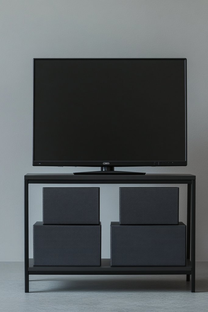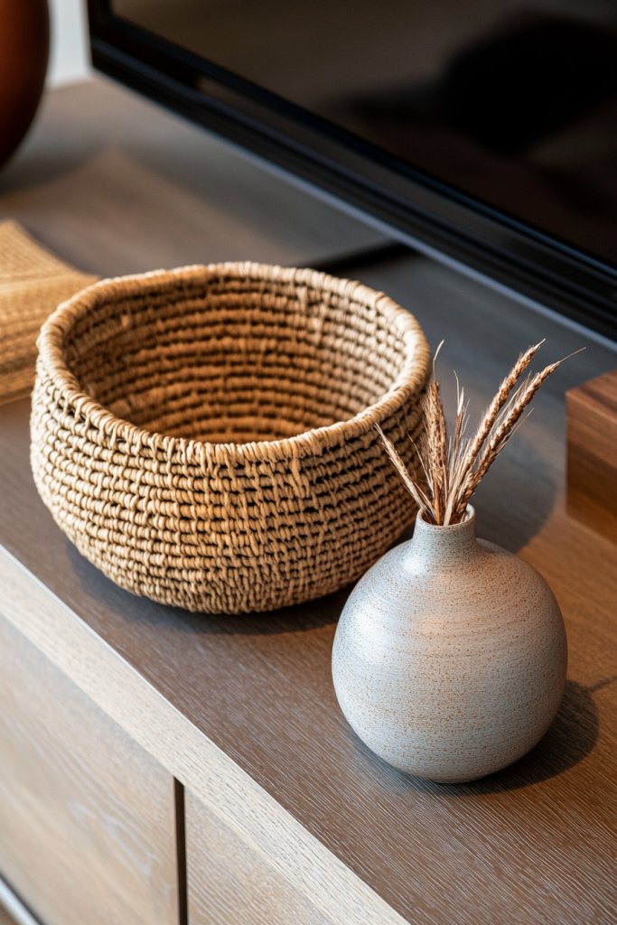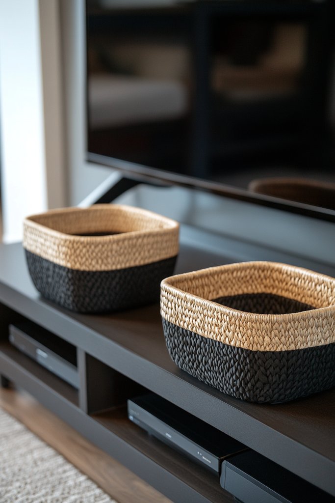 Imagine slim, angular baskets in neutral tones placed beneath or beside your TV stand. They hold remote controls, magazines, or miscellaneous accessories, keeping everything out of sight.