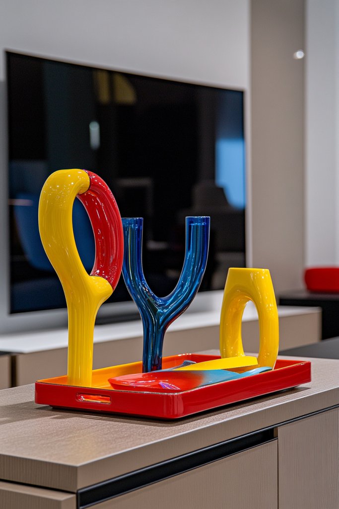 Perfect for those who want to add vibrancy without overhauling everything. Envision a bright, sculptural bowl or a vibrant sculpture placed on your TV stand.