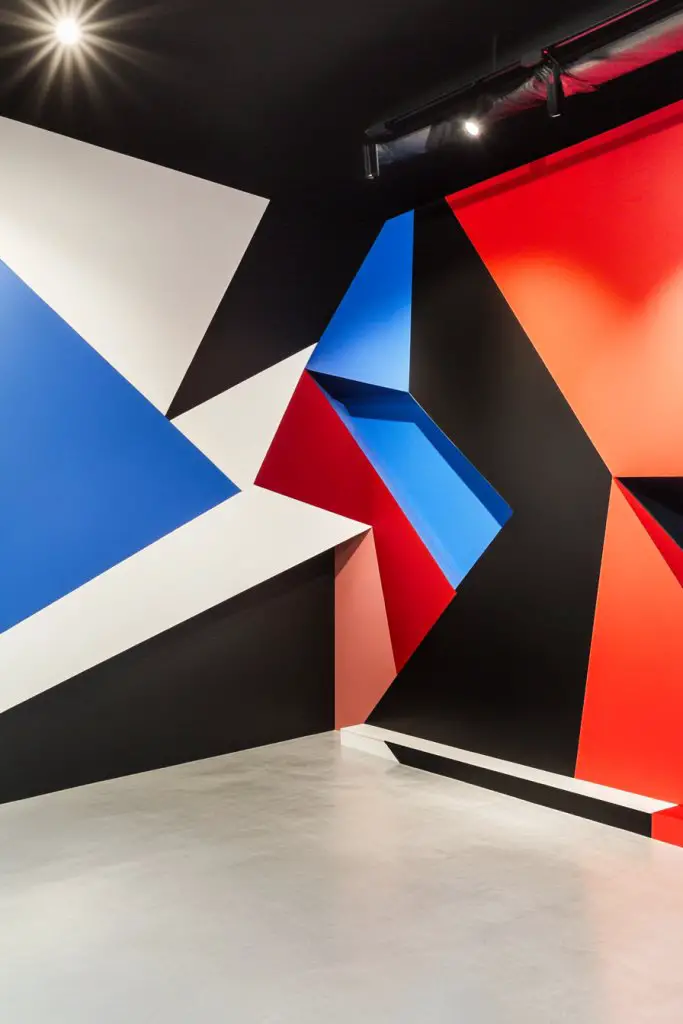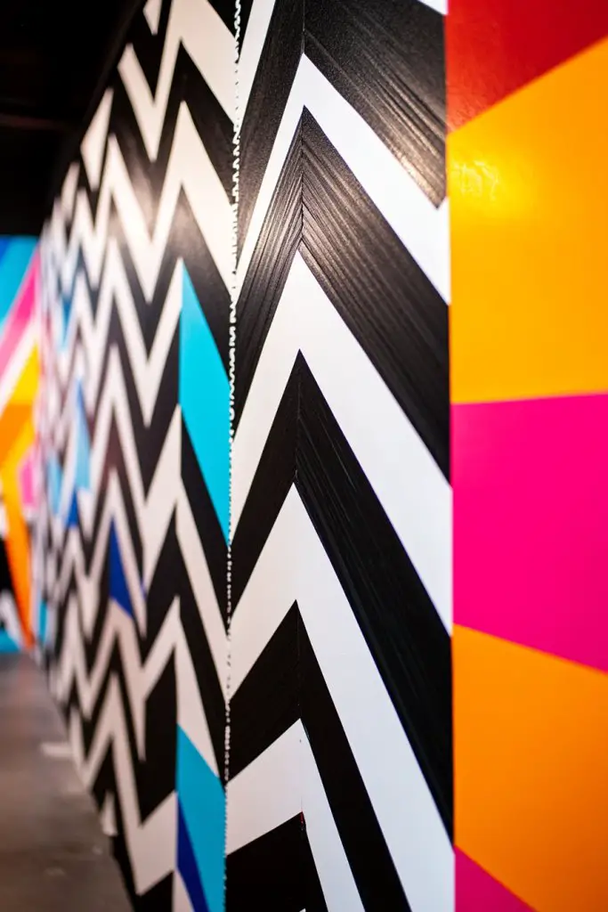 Imagine crisp, clean lines forming triangles, squares, or abstract shapes painted in contrasting colors like black and white or navy and gold. The sharp edges create a sense of movement and energy, giving the room a contemporary feel. You might see a wall with a jagged pattern that looks almost like a piece of modern art. The textures are flat but visually striking, catching the light differently depending on the angle.