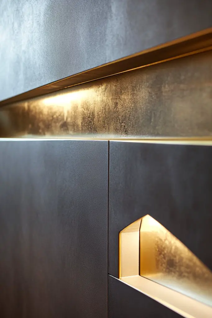 Imagine a wall painted in a matte, muted tone like soft gray or beige, with strategic metallic accents—perhaps in gold, silver, or bronze—highlighting certain areas or lines. The metallic parts reflect light, creating a dynamic interplay of glow and shadow. The overall effect is understated but undeniably chic, adding depth and sophistication. You might see a geometric pattern or random streaks of metallic paint for a contemporary look.