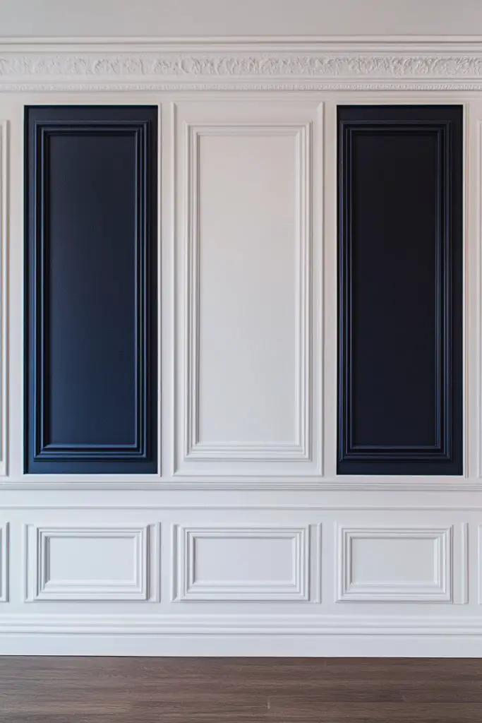 Visualize a section of the wall outlined with simple or ornate molding, painted in contrasting shades—perhaps a deep navy framed by a crisp white. The framed panel acts like a piece of art, drawing attention to the space. The molding adds depth, shadow, and a classic touch, reminiscent of gallery walls or traditional paneling. The effect is both timeless and modern, depending on your choice of mold and color.