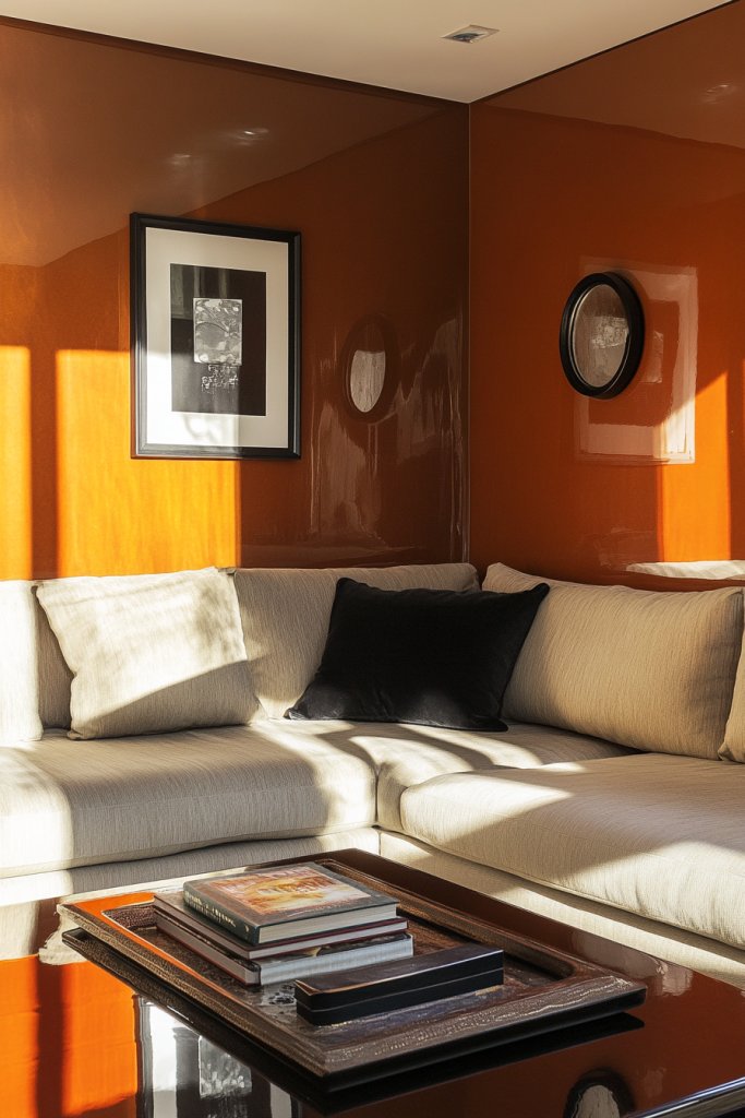 Picture rust-colored walls defining a living zone, paired with contrasting lighter furniture and layered textures. Use strategic placement of rugs and furniture to create visual boundaries. Light-colored curtains or partitions in warm tones further enhance the mood. The space feels energetic yet cozy, perfect for entertaining or family hangouts.