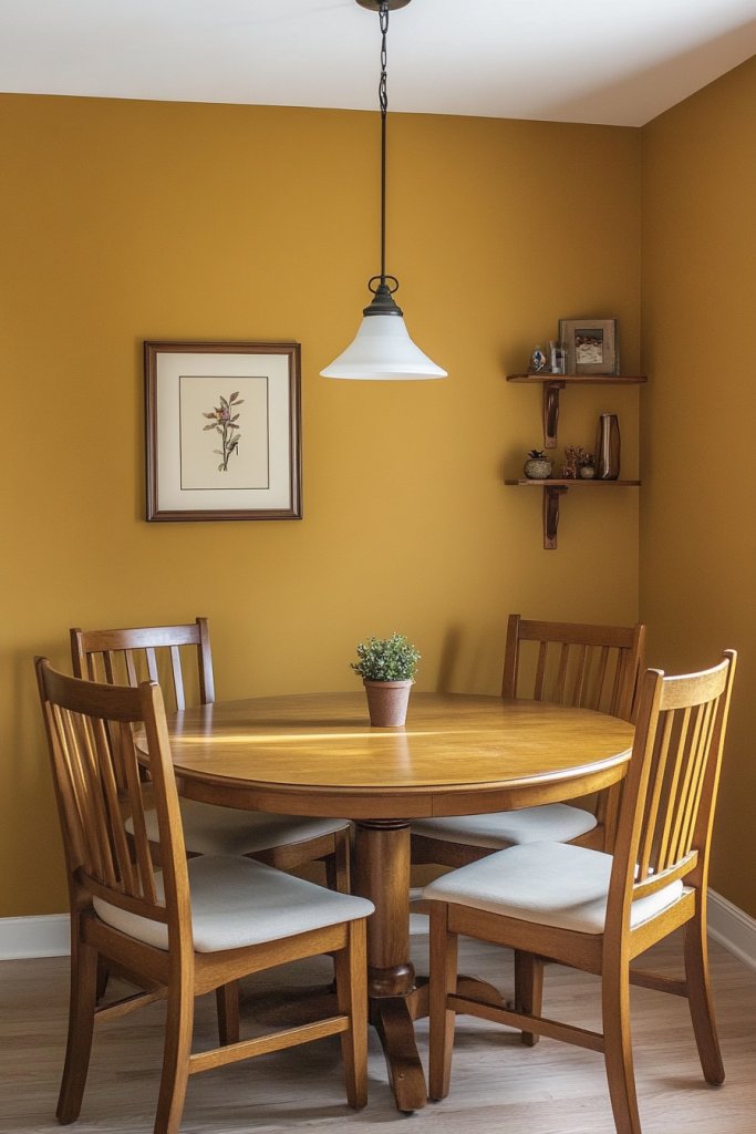 Imagine mustard-colored walls paired with wooden dining furniture and textured textiles. Add a statement chandelier or pendant light with warm bulbs to cast a golden glow. Decorate with colorful ceramics or woven placemats that complement the vibrant hue. The room feels lively, welcoming, and perfect for lively conversations over good food.