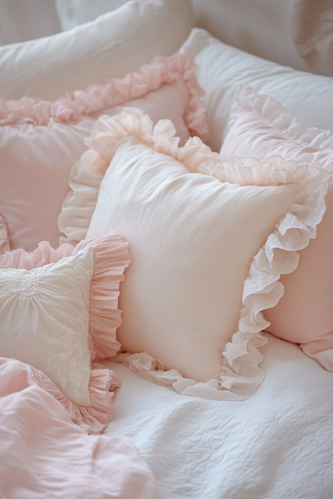 Imagine a bed adorned with pillows featuring gentle ruffles, lace trims, or frilled edges in pastel shades like blush pink, lavender, or soft white. The textures add a whisper of femininity and vintage charm. Stacked slightly asymmetrically, these pillows create a layered, inviting look. Light, airy fabrics like chiffon or voile enhance the romantic feel.