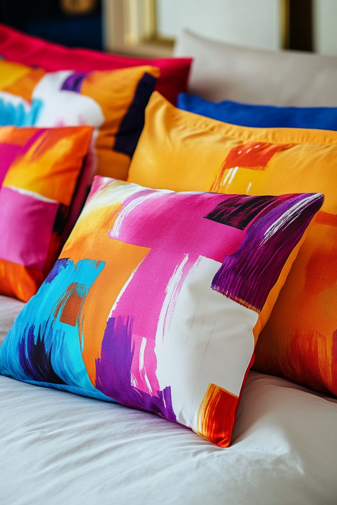 Mix abstract art pillows with more subdued, solid-colored cushions for balance. Use a variety of shapes—square, rectangular, or even irregular forms—to mimic artistic freedom. Incorporate seasonal color shifts—bright and lively for summer, muted and subdued for winter. This style suits contemporary, eclectic, or even boho bedrooms, adaptable to various tastes.