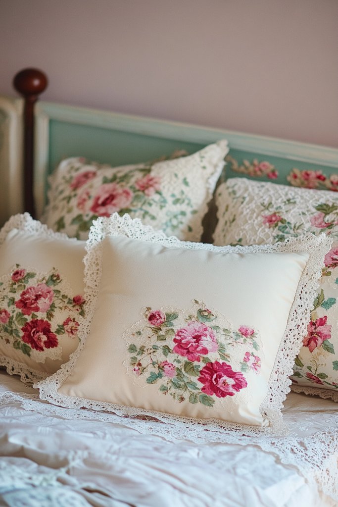 Envision a bed layered with soft floral pillows in pastel shades—roses, peonies, or wildflowers—paired with lace-trimmed cushions. The fabrics are light and airy, with embroidery or appliqué details adding depth. The overall look is reminiscent of vintage linens, cozy and inviting. A gentle mix of textures creates a layered, romantic atmosphere.