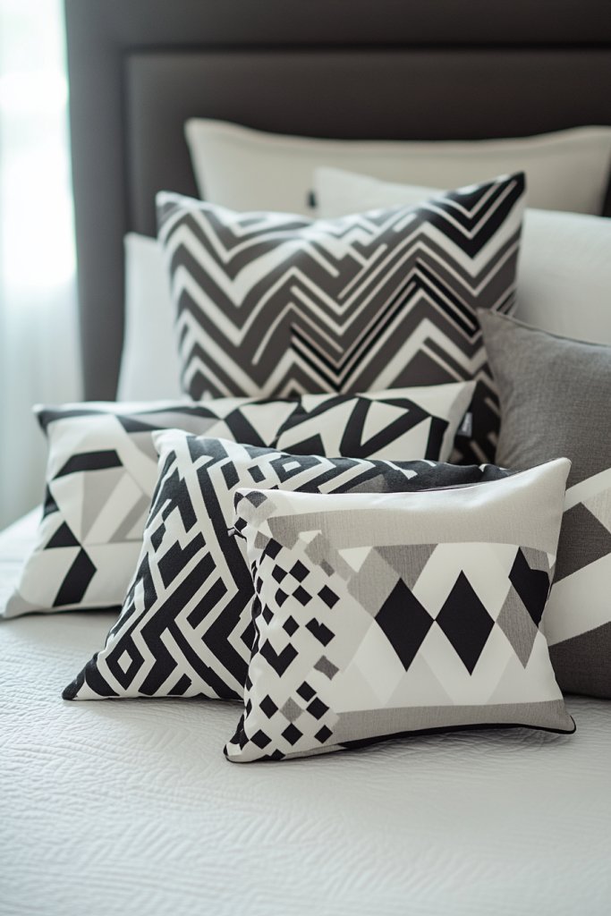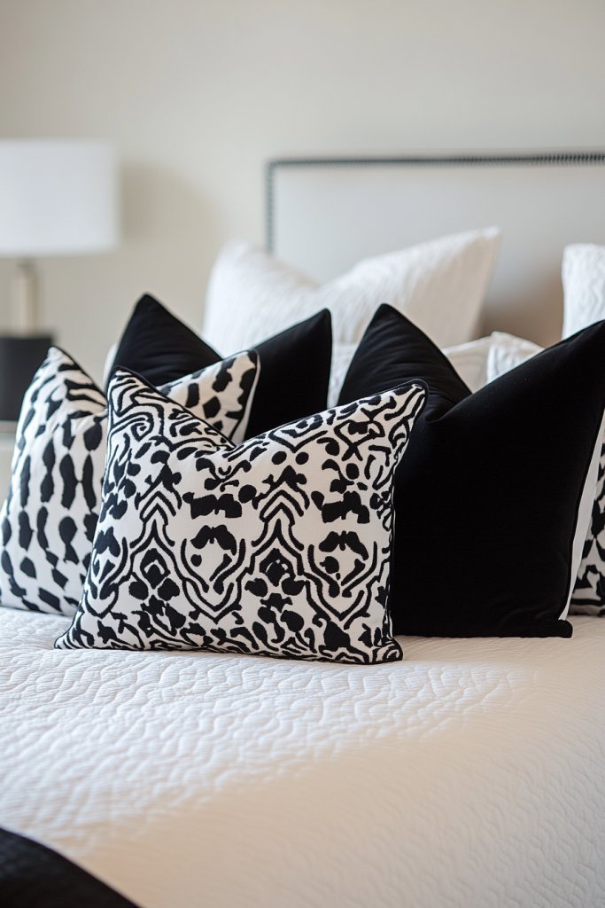Imagine a bed with crisp white sheets paired with black and white patterned pillows—think geometric or abstract motifs. The contrast is sharp, with textures like matte fabric, glossy accents, or embroidery adding depth. A few solid black or white cushions balance the patterned ones and enhance the overall impact. The room feels sleek, contemporary, and visually arresting.