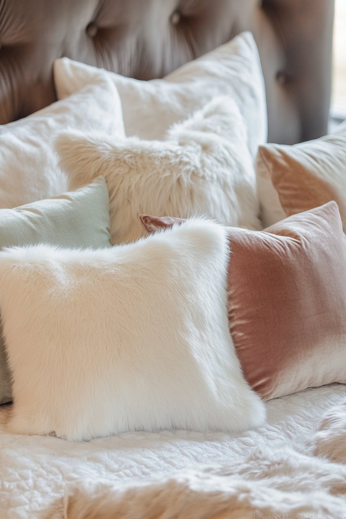 Mix faux fur with velvet or silk pillows for a luxurious feel. Use warm, earthy tones or soft pastels to keep it soothing. Seasonal updates could include swapping the faux fur for lighter fabrics or adding metallic accents for a touch of glam. Scale the arrangement based on your bed size, keeping it inviting but uncluttered.