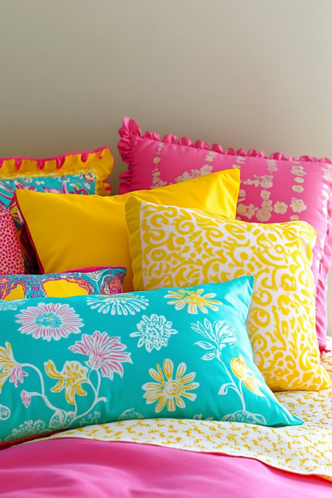 Imagine a bed with pillows in bold, cheerful hues—hot pink, lime green, or electric blue—paired with playful patterns like polka dots, animal prints, or abstract swirls. The textures are soft and inviting, encouraging you to snuggle in. The arrangement is casual, with pillows slightly overlapping, creating a fun, energetic look that feels inviting.
