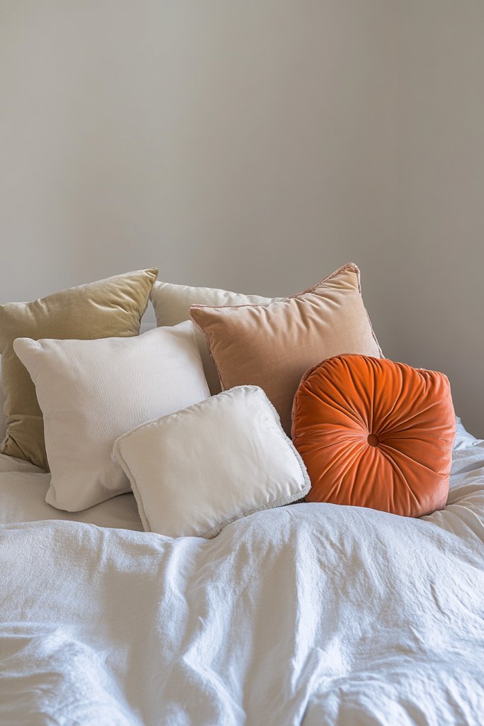Choose high-quality velvet pillows with hidden zippers for easy cleaning. Mix in a few larger square pillows with smaller accent cushions for variety. Arrange the velvet pillows in a stack or slightly asymmetrical for a cozy, lived-in feel. Pair with a matching or contrasting textured throw to add depth. Keep the arrangement relaxed but intentional.