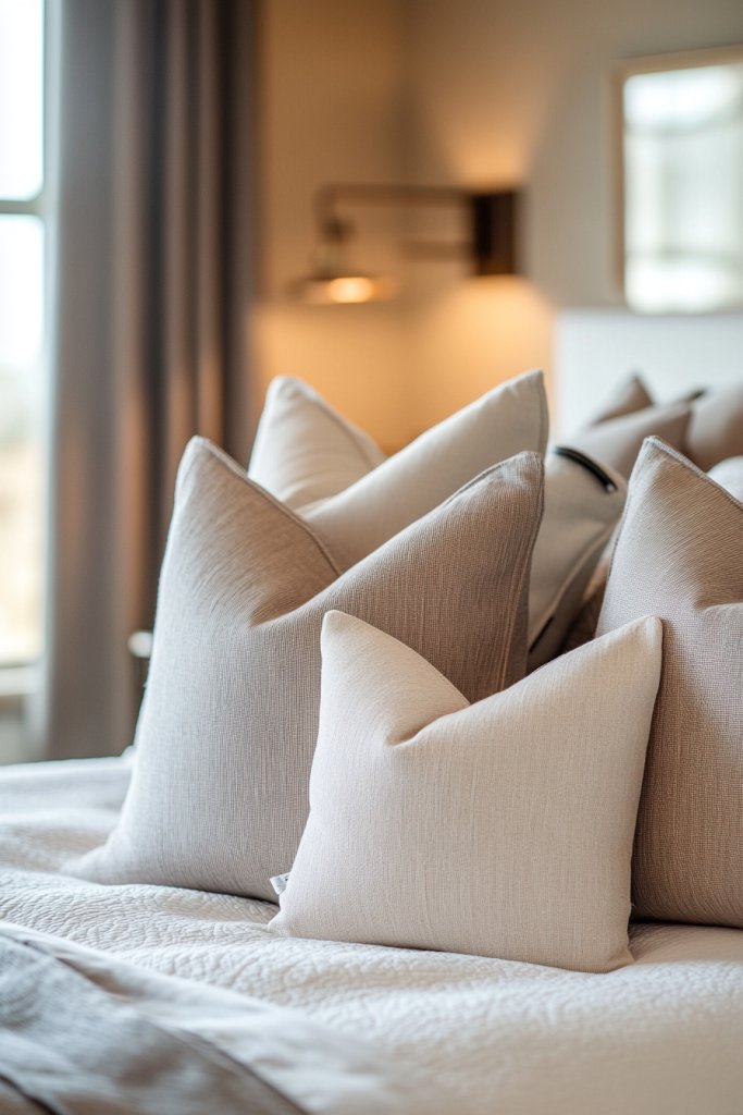 Picture a bed dressed in soft cream and taupe tones, with oversized pillows piled high in varying shades of beige and ivory. The textures differ—smooth sateen shams, chunky knit throws, and velvety cushions—creating a tactile feast. The pillows spill slightly over the edges, giving a luxurious, layered effect. The combination exudes calm, sophistication, and comfort, perfect for relaxing after a long day.