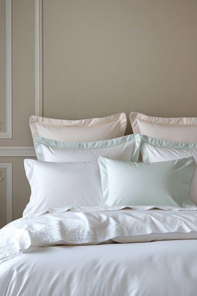 Picture a bed with crisp white or pale grey sheets complemented by soft, muted pillows in shades of beige, blush, or light blue. The textures are simple—cotton, linen, or subtly woven fabrics—creating a serene, airy atmosphere. The arrangement is clean and uncluttered, with a few carefully chosen cushions for subtle contrast. The overall look is fresh, calming, and timeless.