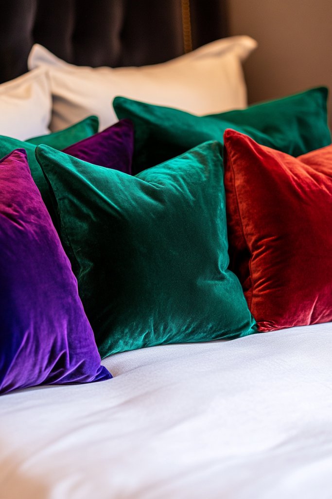 Imagine a bed with deep emerald or royal blue velvet pillows stacked in front of neutral shams. The plush fabric catches the light, creating subtle sheen and richness. A soft throw blanket in matching velvet or silky fabric drapes casually across the foot of the bed. The overall effect is sumptuous yet relaxed, perfect for unwinding in style.