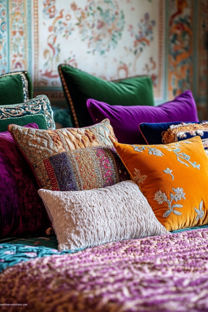 Imagine a bed layered with pillows of various sizes—square, round, and rectangular—in different textures like linen, silk, and embroidered cotton. Vibrant colors, subtle patterns, and tactile textures create a rich, multi-dimensional effect. The pillows spill over the edges, inviting you to touch and settle in. This approach combines comfort with a bold visual statement.