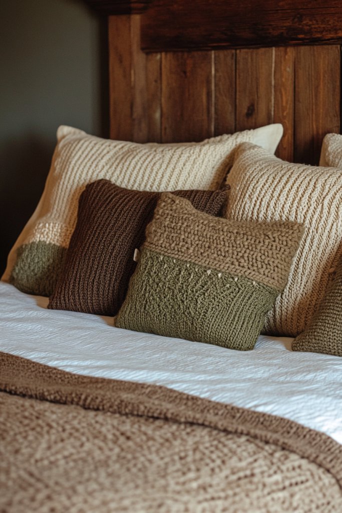 Envision a bed layered with pillows in earthy tones—terracotta, forest green, and cream—featuring woven textures or chunky knits. The tactile quality invites touch, adding warmth to the visual appeal. Some pillows might have a handcrafted look with fringes or braided details, while others are simple knitted squares or rectangles. The overall vibe is rustic, warm, and inviting.