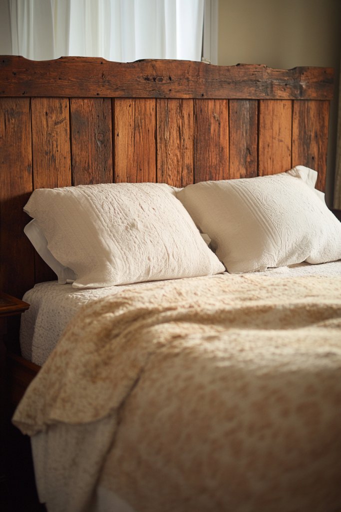 That’s where a reclaimed wood headboard steps in, giving your room instant rustic charm. Imagine a large panel of weathered wood, full of knots, grains, and imperfections that scream authenticity.