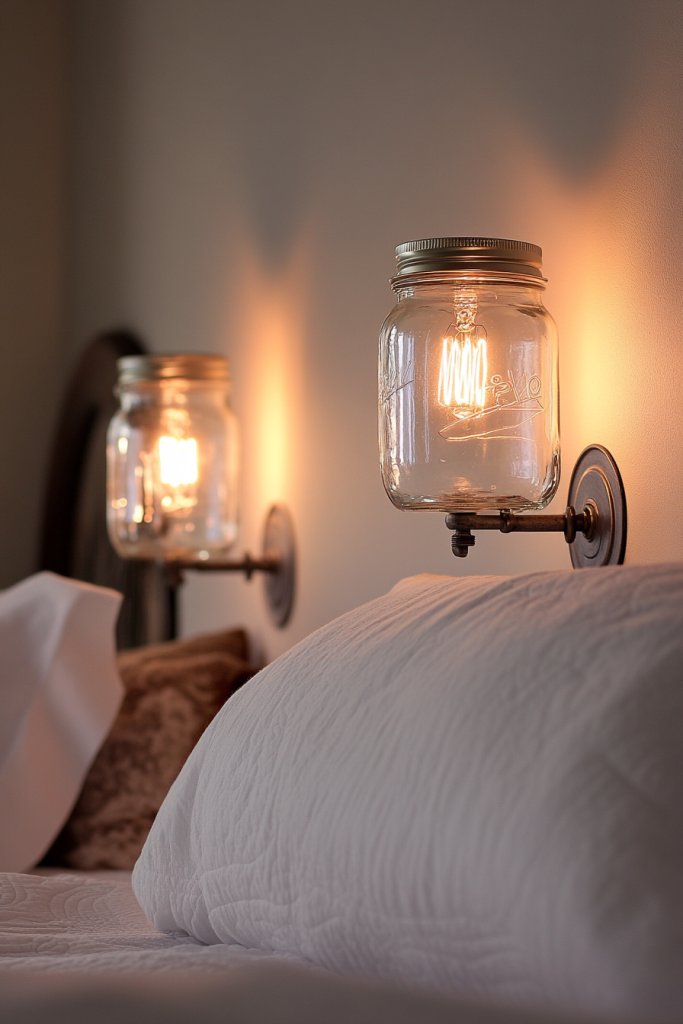 Lighting is key to creating a cozy bedroom atmosphere, but many fixtures lack character. Wrought iron bedside lamps with mason jar shades blend vintage charm with rustic elegance.
