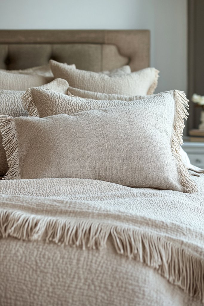 Visualize soft, beige or taupe linens with subtle textures—think linen, chambray, or woven fabrics. Fringe accents along pillow edges or duvet borders add movement and interest.