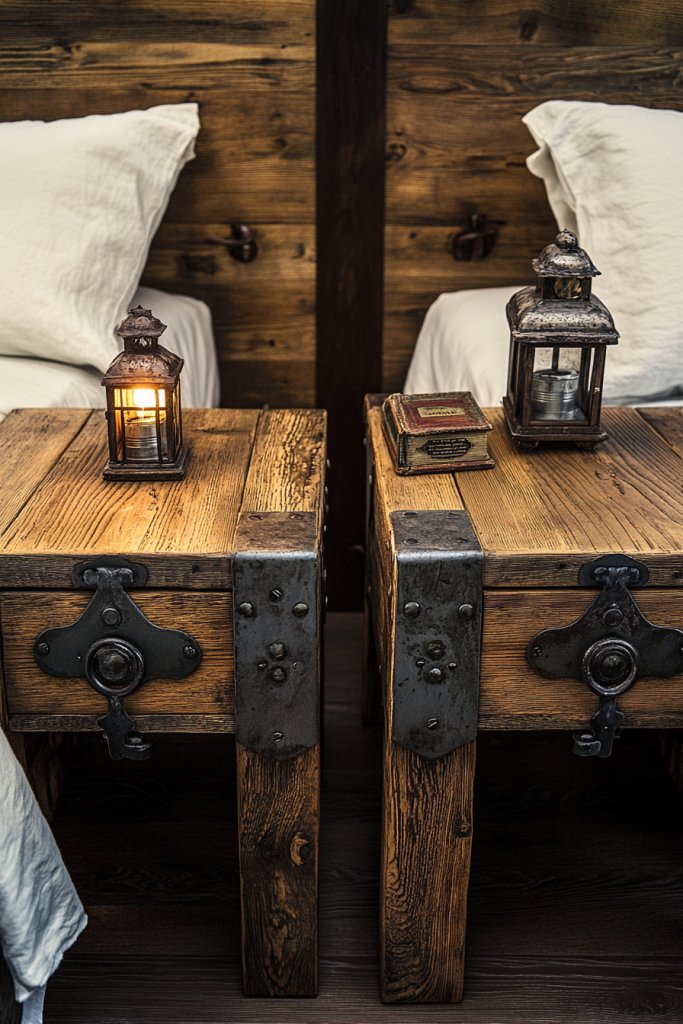 13. Distressed Wooden Bedside Tables with Metal Accents