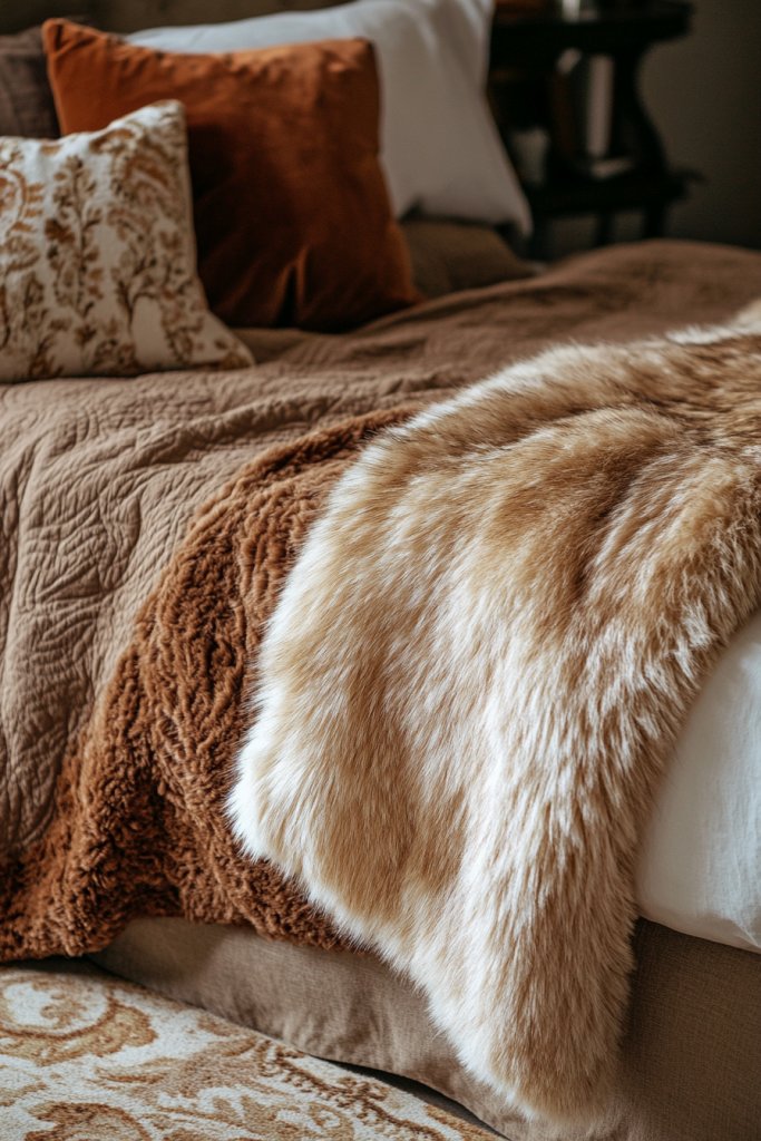 Looking to make your bedroom feel more inviting and plush? Faux fur throws are the perfect solution. They add a layer of softness and warmth that instantly elevates your rustic decor while keeping you cozy.